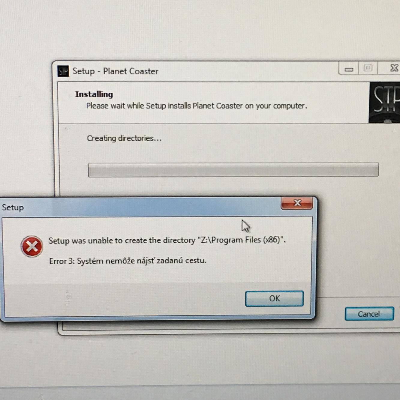 Dobrý deň, pri inštalácii hry Planet coaster mi hneď po zvolení cesty kam to má nainštalovať vybehne Eror : setup was unable to create the directory "Z: Profram Files (x86)" Eror3 : systém nemôže nájsť zadanú cestu.
