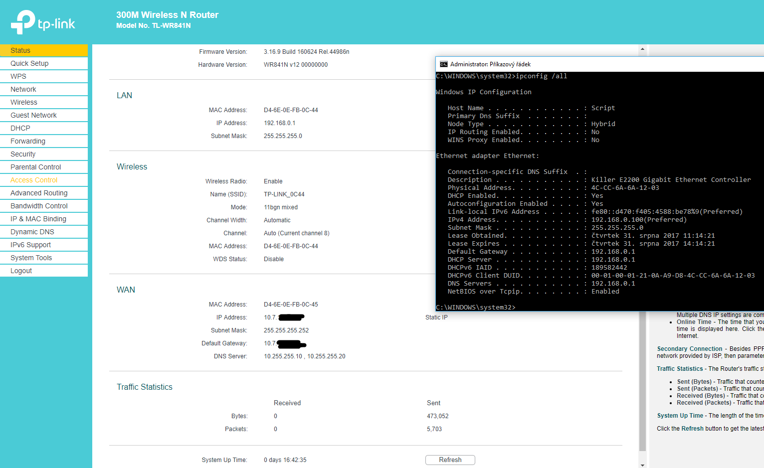 Vypis ze status stranky routeru a vypis ipconfig /all.