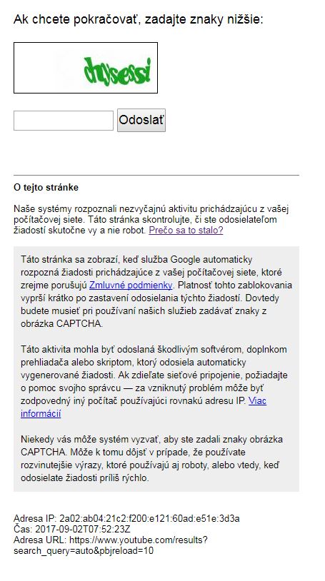 Zdar v poslednej dobe mám problém s vyhľadávaním na yotube. Všimol som si to náhodne ,keď som hľadal nejaké návody do photoshopu.Buď mi vyhodí hlášku či som robot a štandardné zaškrnutie,alebo mi hodí opäť známe overenie cez text.Čo je zaujímavé ,že mi tam vypíše moju IP ,ktorá je ,ale dosť divná a vyzerá to ,že mi zobrazuje dočasnú adresu IPv6. Otestoval som to aj na online stránkach a vypisuje mi to čo na youtube.Potom som opäť skúsil inú online stránku na IP a zasa mi hodilo niečo iné som z toho paf.