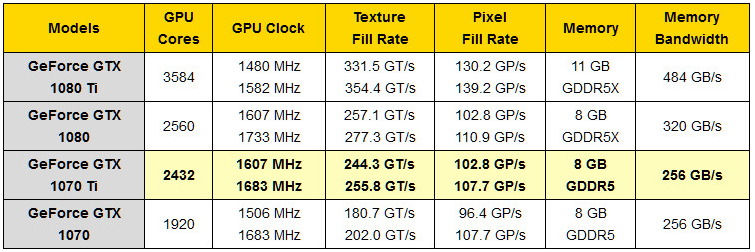- To muzes rovnou koupit GTX@1080 kde jde skoro o identické parametry az na "Memory BandWidth" kde GTX@1080 je na 320GB/s o proti 256Gb/s pro GTX@1070Ti.