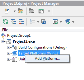 Když ve stávající 32b aplikaci chci v okně Project Manager přes pravé tlačítko myši na Target Platforms (Win32) přidat další platform, tak se objeví AddPlatform, ovšem podsvícené šedě a další platforma přidat nejde.