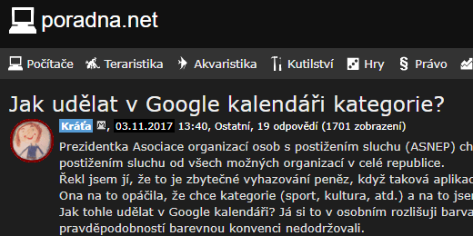 Jak tohle udělat v Google kalendáři? Já si to v osobním rozlišuji barvami. Ale do společného "celorepublikového" by byly lepší ty kategorie, jelikož ti, co by akce vkládali, by s největší pravděpodobností barevnou konvenci nedodržovali.