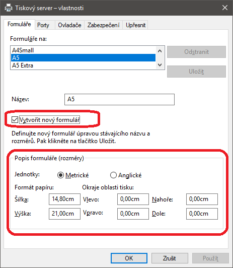 Ano tady to vytvořené mám. Ale s ovladačem, kde tento ručně vytvořený formát mohu vybrat a použít nefunguje tiskárna. Naopak s ovladačem, kde funguje tiskárna nelze vybrat ve formátu papíru nic jiného než A4 a letter. Takže ani ručně vyrobený formát.