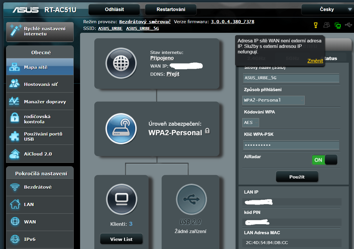 Adresa IP sítě WAN není externí adresa IP. Služby s externí adresou IP nefungují. Máš "externí adr…