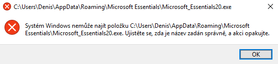 Odinštaluj korektne ten Essentials (ak ho ešte máš), aktivuj si prednastavený Defender - vid https://pc.poradna.net/files/80561-problemik-png - tam píše o Essentials - prečisti si registre, pretože nemôže nemôže nájsť cestu k tomuto programu.