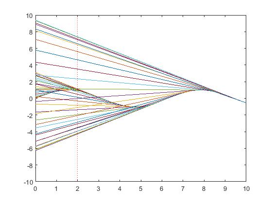 Kdežto, pokud interval ve funkci fplot nahradím intervalem např. [0 xu] => fplot(fce,[0 xu]);hold on (čili alespoň jedna mez je - dá se říct - konstantní) - vykreslí se mi všechny přímky. Avšak samozřejmě ne tak, jak požaduju - obrázek č.2.