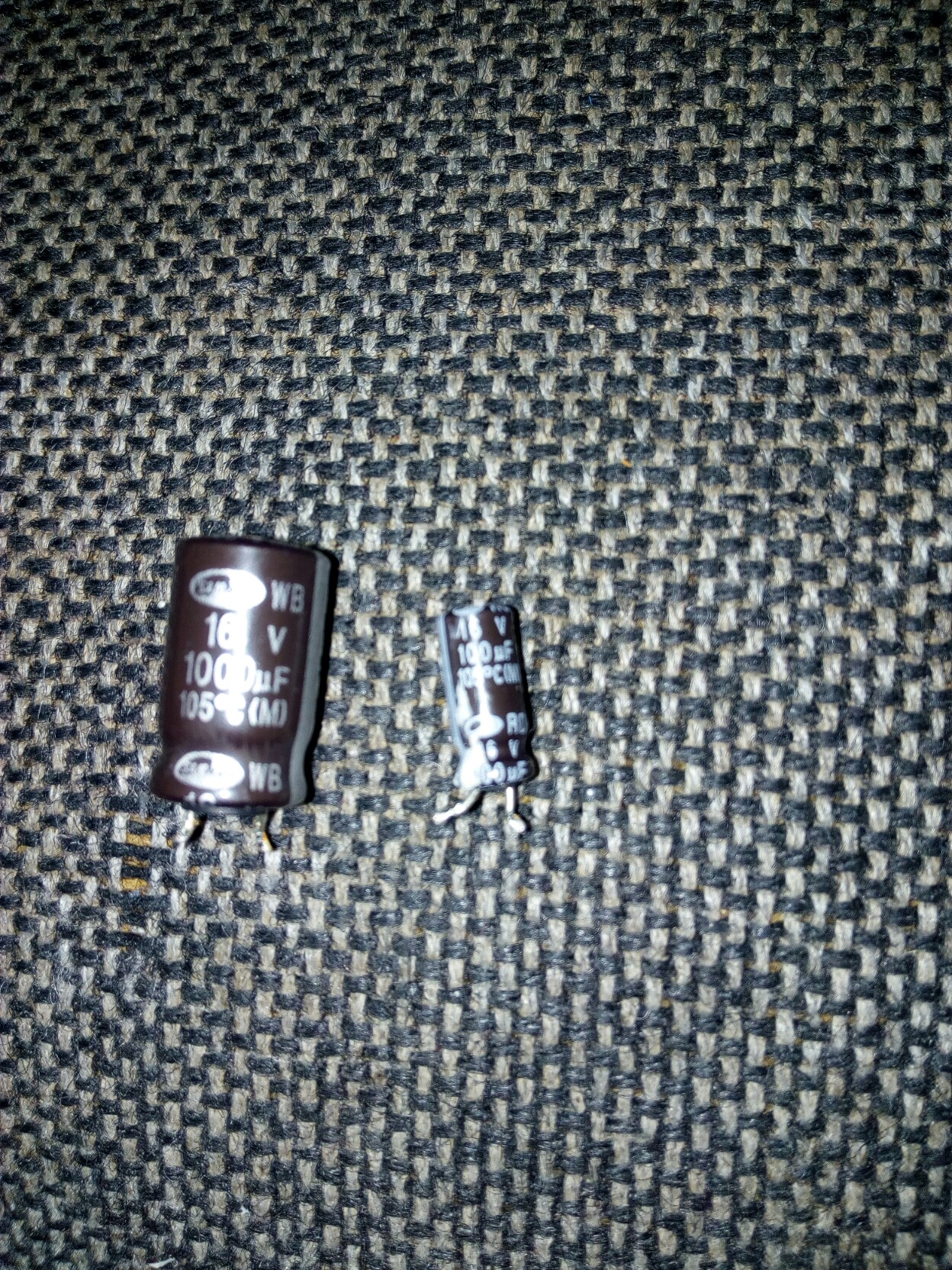 Jj, ten třetí dole zleva bude potřeba vyměnit. Můžeš použít jiný z nějaké vyřazené elektroniky co doma najdeš, ale dodržuj napětí a kapacitu, nesmí být nižší. Vyšší kapacita o trochu nevadí.