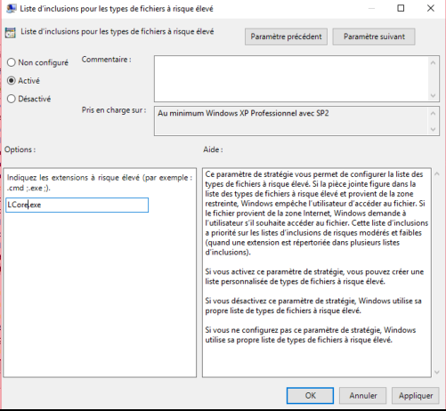 • Na pravo : "Nastaveni uzivatele/user config" -> "Admin template (Administratorska sablona)" -> "Windows komponenty/slozky " -> "Attachment Manager" a do "Inclusion list" pridas tvuj LCore.exe -> "Aplikovat" :