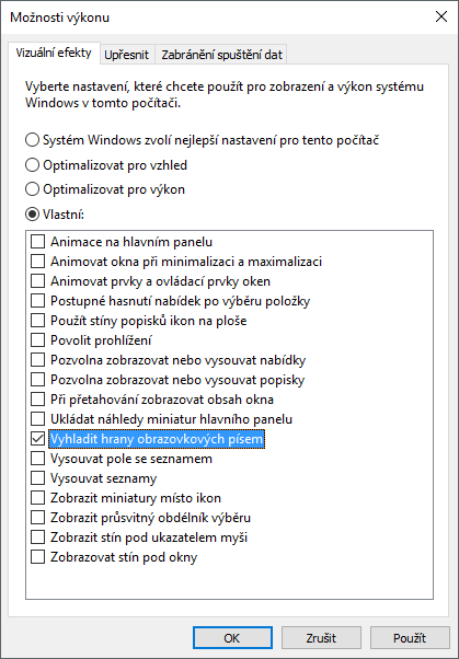 To ano, ale já chci nastavit "Optimalizovat pro výkon", aby byl PC o něco málo výkonnější. Akorát nevím, zda se dá někde nastavit, aby se i při této možnosti zachovalo písmo...
