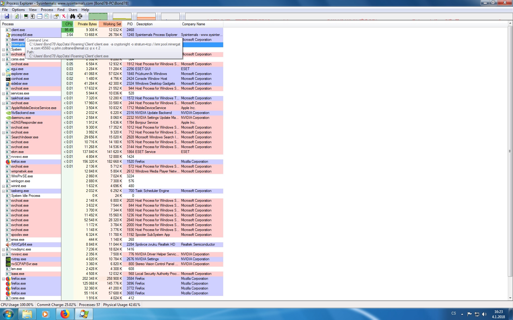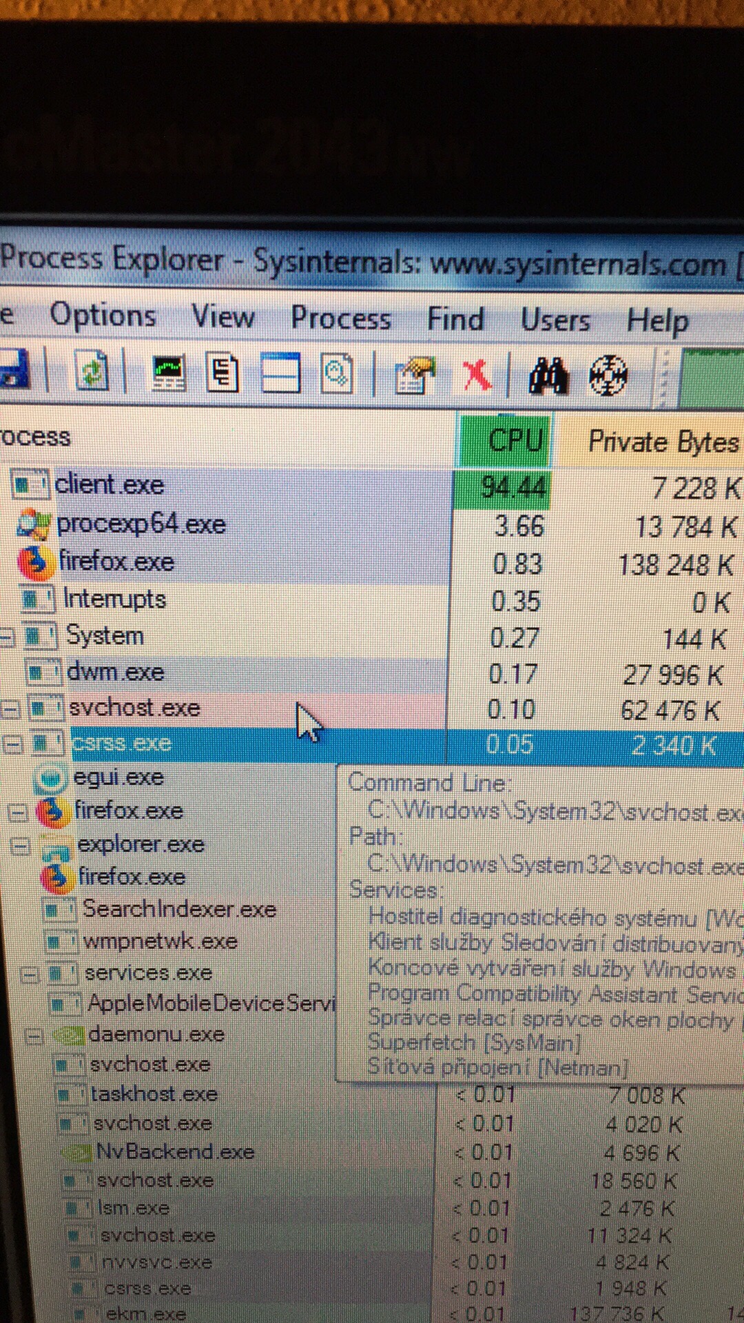 Díky za odpověď. Zjistil jsem že CPU mi témeř ze 100% vytěžuje nějaký client.exe. Smazal jsem ho v běžících procesech, ale po restartování systému znovu naběhl, a s ním i vytížení CPU na 100%. Co s tím? Poradíte jak ho natrvalo odrtánit z PC? Děkuji