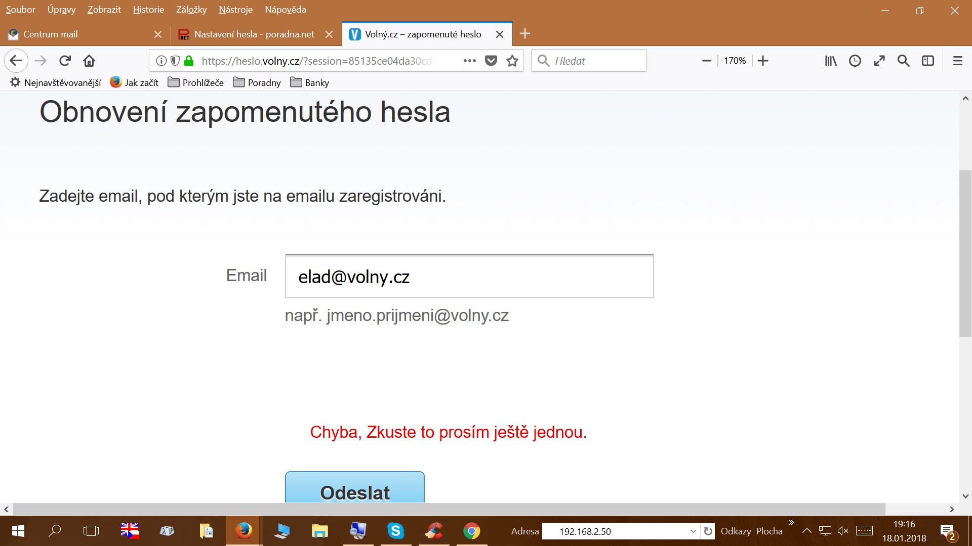 Zkusil jsem požádat o obnovení hesla na tu adresu z obrázku a zjevilo se tohle: