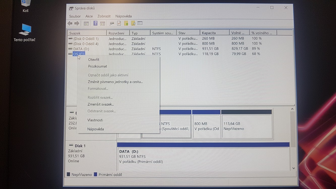 * Zkratka rozsiris to C:/ 118Gb (SSD) o tech 113Gb co budou smazany (momentalne oznaceno jako svazek E:/(coz je to samé SSD)).