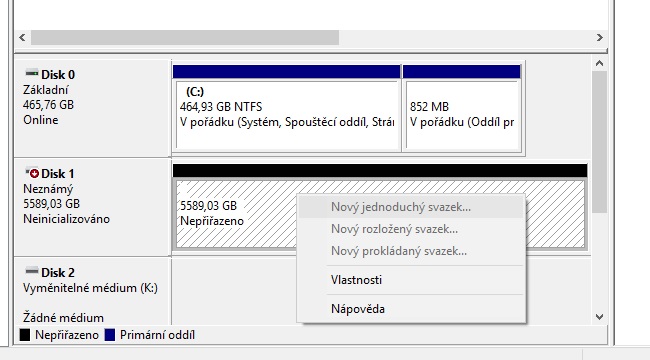 Máš tam taky Neinicializováno. Okno inicializace by se ti mělo ukázat po prvním spuštění PC po připojení toho nového disku. Proběhlo něco takového? Pokud ne, zkus ten disk odpojit, zrestartovat PC, pak vypnout a znovu přidat ten disk. Musí se pak po startu systému objevit dialogové okno s dotazem na inicializaci.