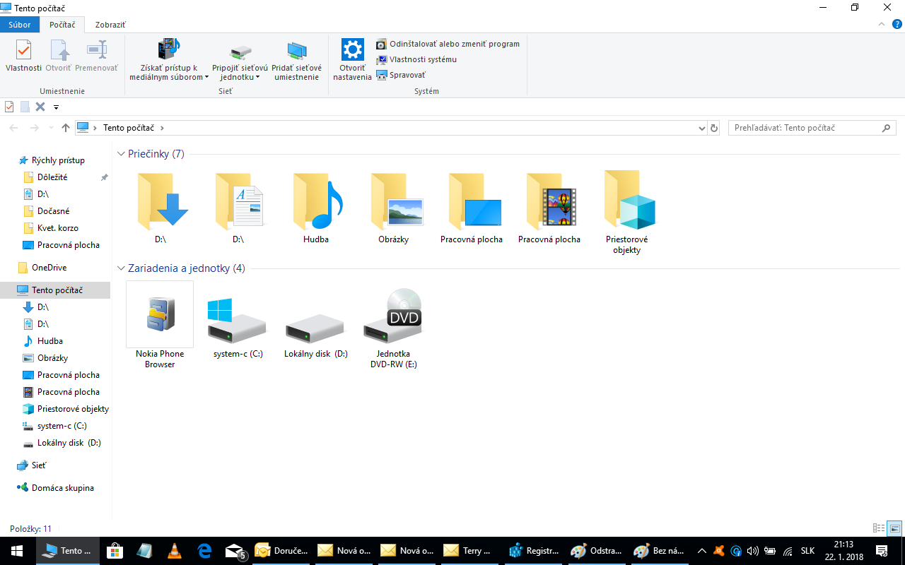 Mám WIN 10 v ntb a po prenášaní súborov z céčka na déčko, sa mi po otvorení položky Tento počítač, zobrazia dva priečinky D:/ a D:/. Ako sa ich zbaviť? Vymazať sa nedajú ani presunúť. Keď ich otvorím, oba obsahujú tie isté súbory, ktoré ležia na lokálnom disku D.