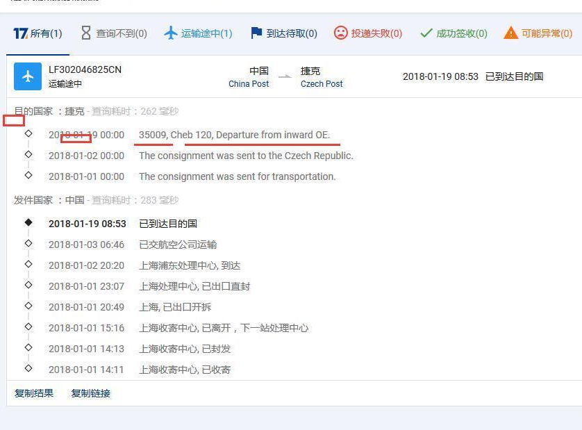(0) úspěšné označení (D) může být abnormální (0) LF3020468 25CN Czech Czech 2018-01-19 08: 53 dosáhl národní tranzitní země určení China Post Česká pošta tři: Česká doba hledání: 262 slov sekund ◇ 20HH 0000 35009, Cheb 120, odjezd z vnitřní OE 2018-01-02 00:00 zásilka byla poslána do češtiny Republiky. 2018-01-01 00:00 Zásilka byla odeslána k přepravě. Odchozí Země: China Poptávka čas: 283 sekund 2018-01-19 08:53 Dům byl předán rozsekat 01.03.2018 06:46 01.02.2018 20:20 Shanghai Pudong Air Division zpracování dopravním centrem) přijíždí ◇ 2018-01-01 23:07 Šanghaj pohřben centrum, bylo vyvezeno rovně ◇ 2018-01-01 20:49 Šanghaj, 3 z 2018-01-01 15:16 Šanghajské přijímací centrum, odešel pod One-stop processing center 2018-01-01 14:13 srdce minulý měsíc, byl zapečetěn