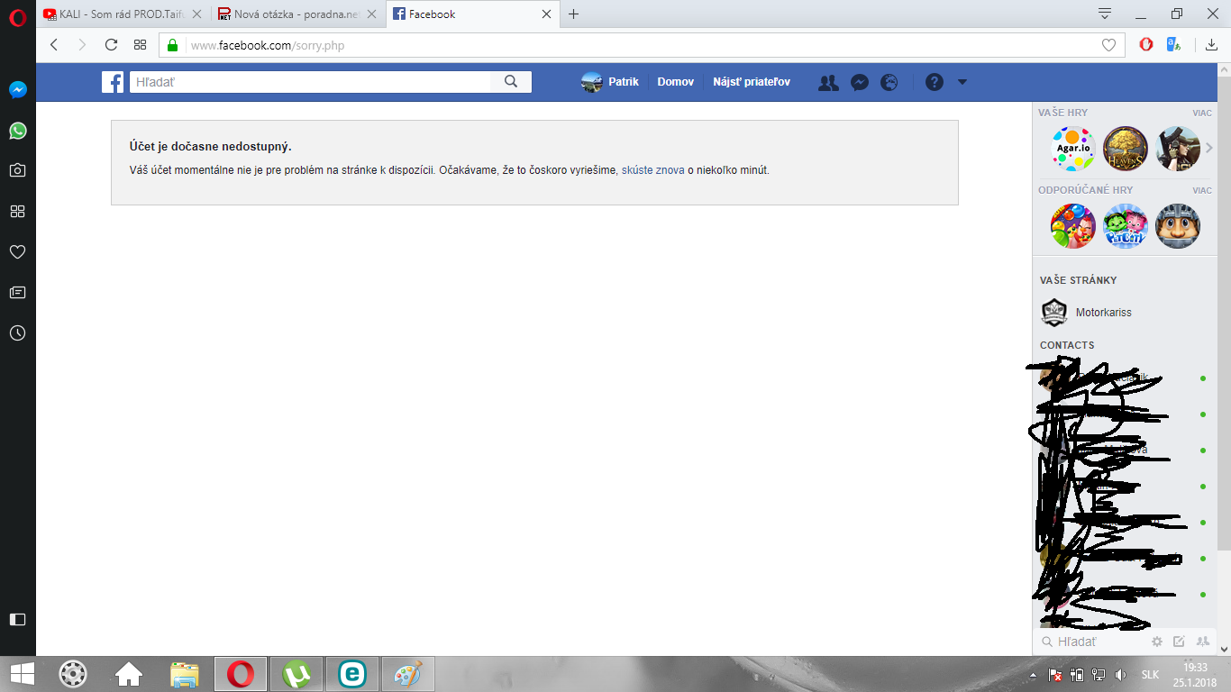 Dobrý večer, potrebujem pomoc keďže mi zničoho nič prestal fungovať pred cca 30min facebook. (Na mobile messenger mi funguje v pohode)