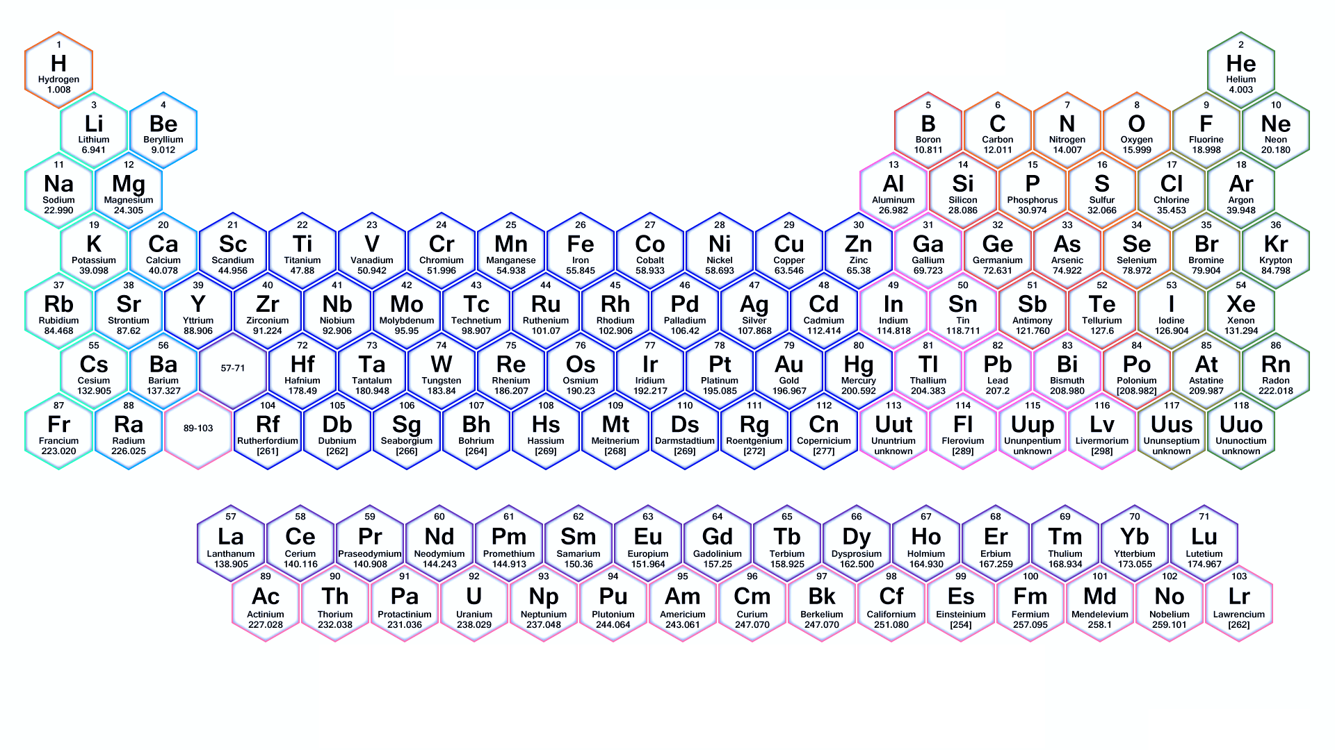 Jestli to chceš zvětšovat na A0,musíš to dělat v křivkách.Tabulku v křivkách si můžeš stáhnout třeba tady,ale je jen se čtverci a s malými písmeny v názvech prvků.Ale jde z toho vše vytáhnout a vložit do těch šestiúhelníků.Soubor ai nebo eps,zkoušel jsem to v Corelu.Jen text není už text,ale převedený do křivek.Když si uděláš šestiúhelníky velikostí na rozteč textů,jde to kopírovat i po celých řadách.Pak to celé doladit,porovnat a sloučené zvětšit dle potřeby.