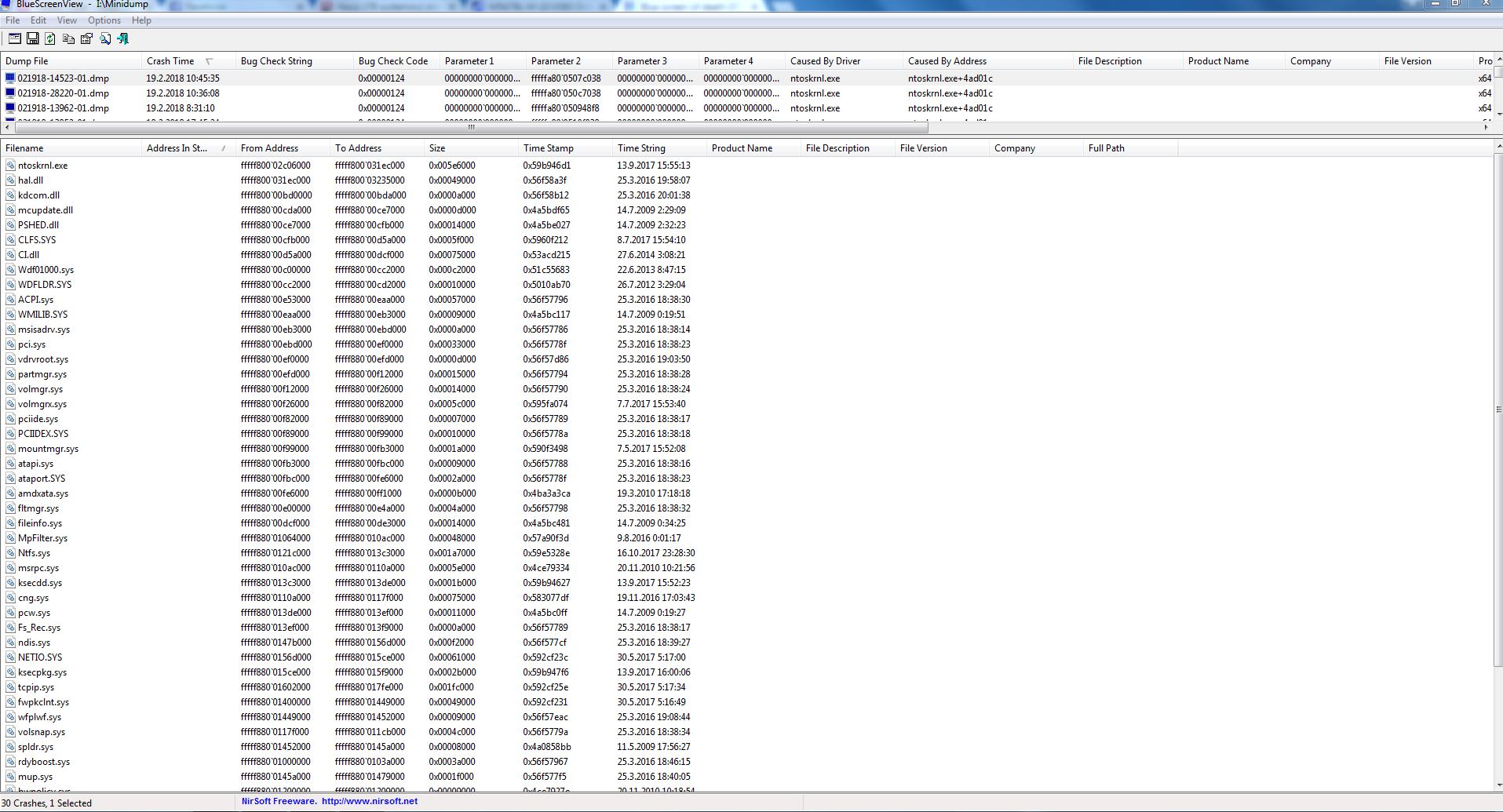 Padá to na procesu z jádra Windows, chyba 0x00000124 je dle Googlu obecná HW chyba - čili Windows zjistily HW problém, ale nejsou schopny určit kde - to se bude fakt těžko hledat...