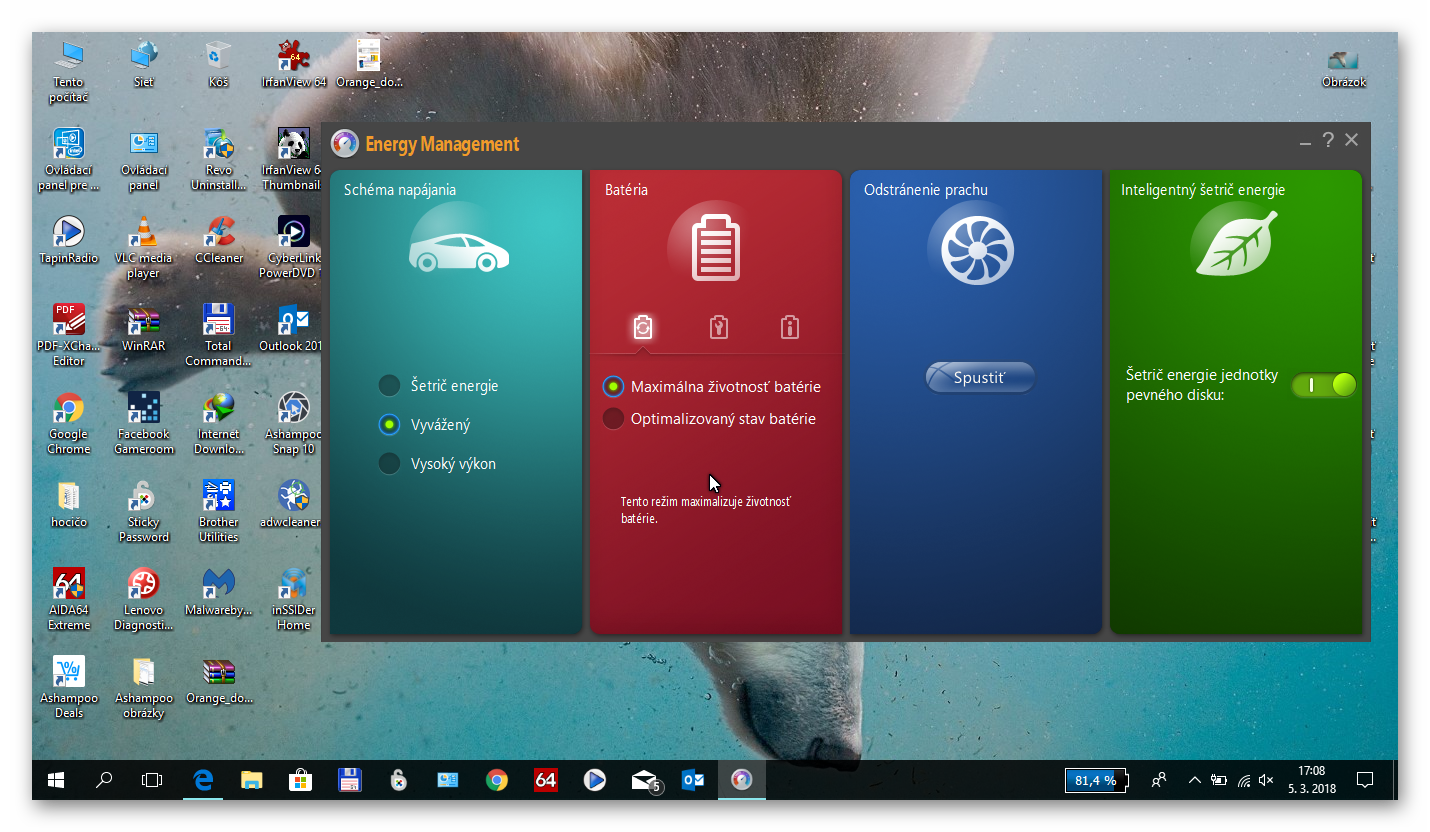 Dobrý deň,chcel by som sa opýtať,ako vlastne funguje nabíjanie batérie v notebooku Lenovo.Cez Energy Management v časti Batéria to mám nastavené na Ptimalizovaný stav batérie:V tomto režime je nabíjanie batérie obmedzené na 60 % jej plnej kapacity. Tým sa môže znížiť opotrebenie batérie a predĺžiť jej životnosť.Tomu rozumiem,ale nechápem som na skúšku vytiahol adaptér (aj v prípade prerušenia el.prúdu) zo zásuvky na 3 min. znova zapojil kapacita batérie klesla na 57 aj nejaké drobné %,znova som ho zapojil ale napísalo,zapojené nenábija sa.Že vlastne kedy to začne nabíjať.Os W 10,Lenovo G 500