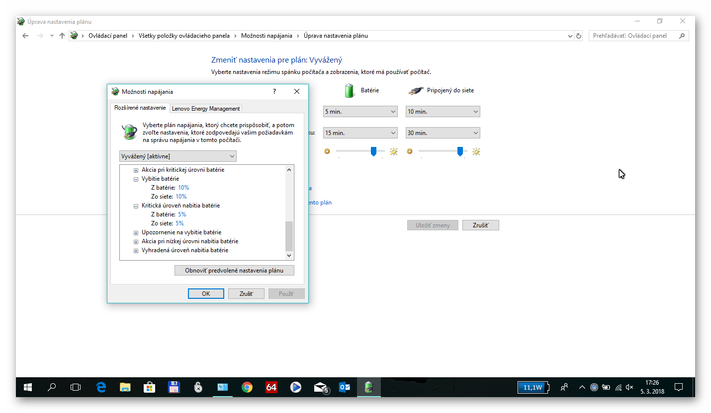 Ok ale my príde z toho obrázka,že keď to mám nastavené na Optimalizovaný stav batérie tak sa v prípade že vypne elektrina začne nabíjať až pri 5 alebo 10%,že je to nejak prepojené čo sa týka nastavení Energy Management a v ovládacom paneli Možnosti napájania.Ok nechám to tak nič tam meniť nebudem vypne nabije pri určitých percentách