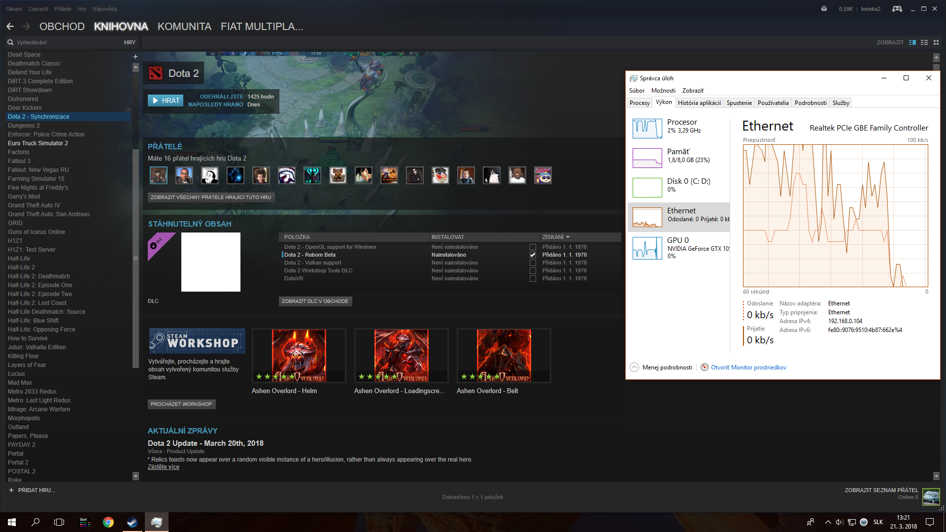 Dobrý deň. Všetko to začalo po tom čo som robil "cable management" na svojom stole. Keď som zapol multiplayerovú hru [Dota 2], tak asi v piatej minúte začala sekať a úplne vyhodila internet, tak že tam pri tej ikonke bol žltý trojúholník. Potom neskôr, keď som hral hru ETS2 [singleplayer] a tiež vyhodila internet, ktorý sa potom ale pripojil. Neskôr som sťahoval hru Witcher 2 a vtedy internet vypadol úplne a už sa nepripojil. Tak som zavolal jedného IT-čkara. Ten si PC zobral domov a keď ho pripojil na svoj kábel, tak fungoval hneď. Tak mi ho vrátil. Išiel aj mne, no potom som vyskúšal hrať toho Witchera 2, tak asi po dvoch hodinách zase vypadol a už sa nepripájal. Tak som znova zavolal IT-čkara, ktorému to doma hneď po pripojení išlo. Ale teda že mi premaže celý Windows. Tak tak urobil a ja som dnes zapol Dotu a asi v piatej minúte začala zase sekať, ako vtedy prvý krát. Spravil som pár print screenov a rýchlo to vypol, pred tým ako zase vyhodí ten internet. Prosím pomoc, som bezradný. Ďakujem.