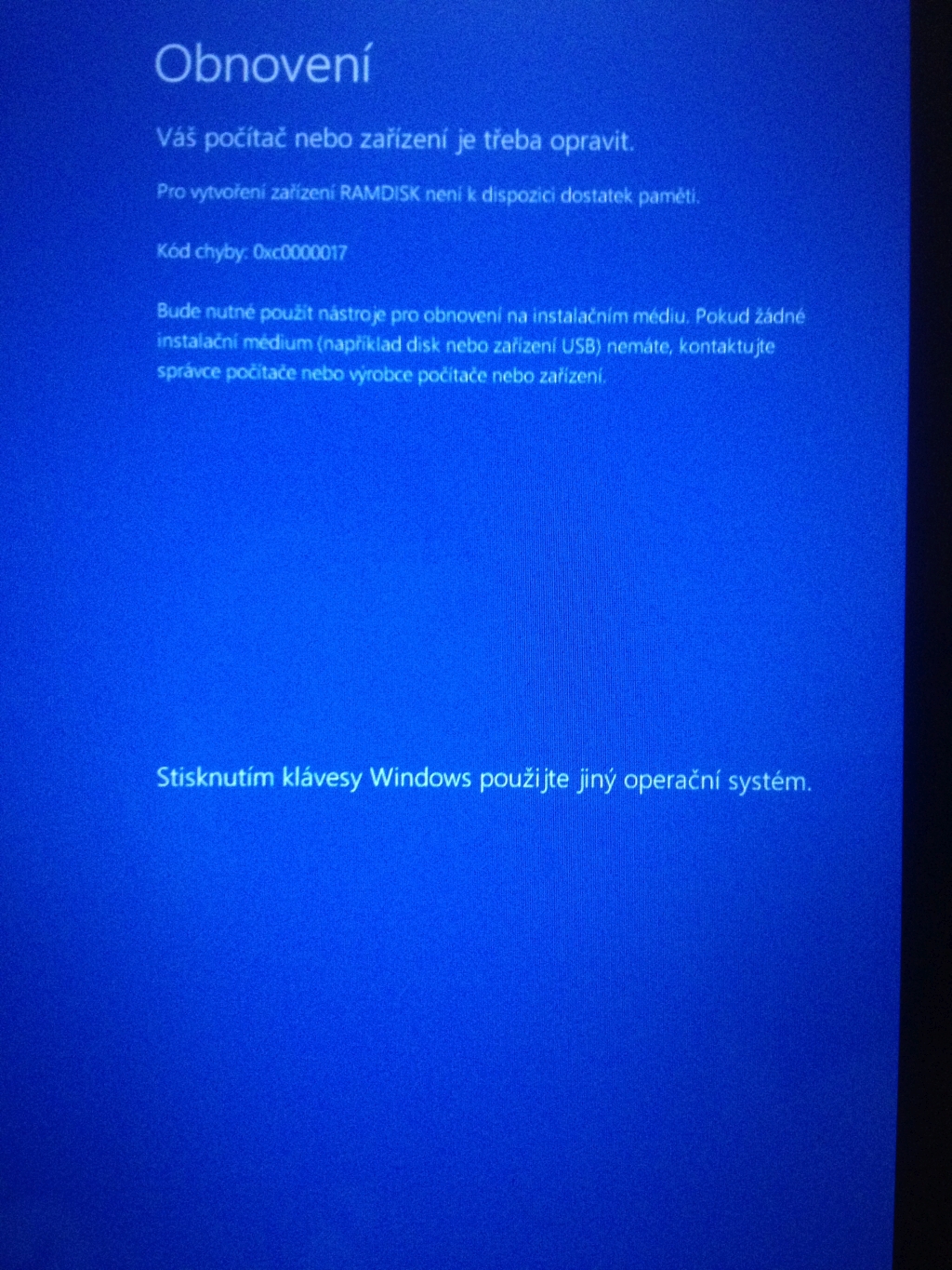 Zdravím. Mám tablet Umax Visionbook 8Wi Plus s Windows 10. Objevuje se na něm po zapnutí hláška, že končí podpora mojí verze systému Windows a že je třeba zaktualizovat na novou verzi (1709 - Fall Creators Update). Aktualizace se stáhne, probíhá její instalace, poté dojde k restartu tabletu kdy ještě probíhá příprava na aktualizaci a hned potom vyskočí modrá obrazovky s chybovou hláškou ,,Pro vytvoření zařízení RAMDISK není k dispozici dostatek paměti´´ a tablet nenaběhne - viz. foto v příloze. Musím ho vypnout a zapnout a poté se vše opakuje od hlášky že je třeba aktualizovat systém. Tak nějak tuším že bude problém v paměti RAM tohoto tabletu, která je jen 1GB, na druhou stranu vlastně tablet splňuje minimální požadavky systému Win 10, tak by to podle mě nějak fungovat mělo. Nemá někdo nějakou zkušenost s takovým problémem a jak to třeba může jít vyřešit ? Samozřejmě můžu zakázat službu Windows Update, což vyřeší zbytečné pokusy o stažení a instalaci updatu, nicméně hláška o neaktuálnosti systému mi vyskakuje po zapnutí stejně dál.