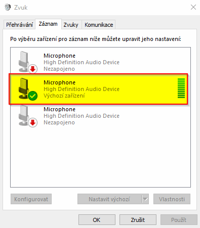 Připoj mikrofon (sadu). V nastavení zvuku si ověř, zda je mikrofon nastaven jako výchozí zařízení pro záznam