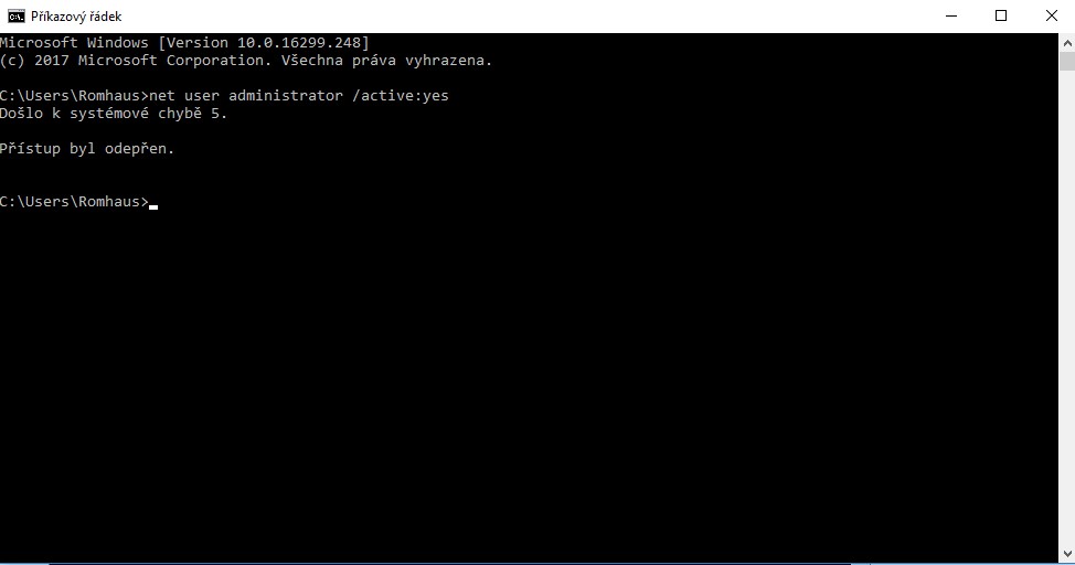 Spustím CMD příkazový řádek, vepíšu příkaz a vyhodí to: Došlo k systémové chybě 5, Přístup byl odepř…