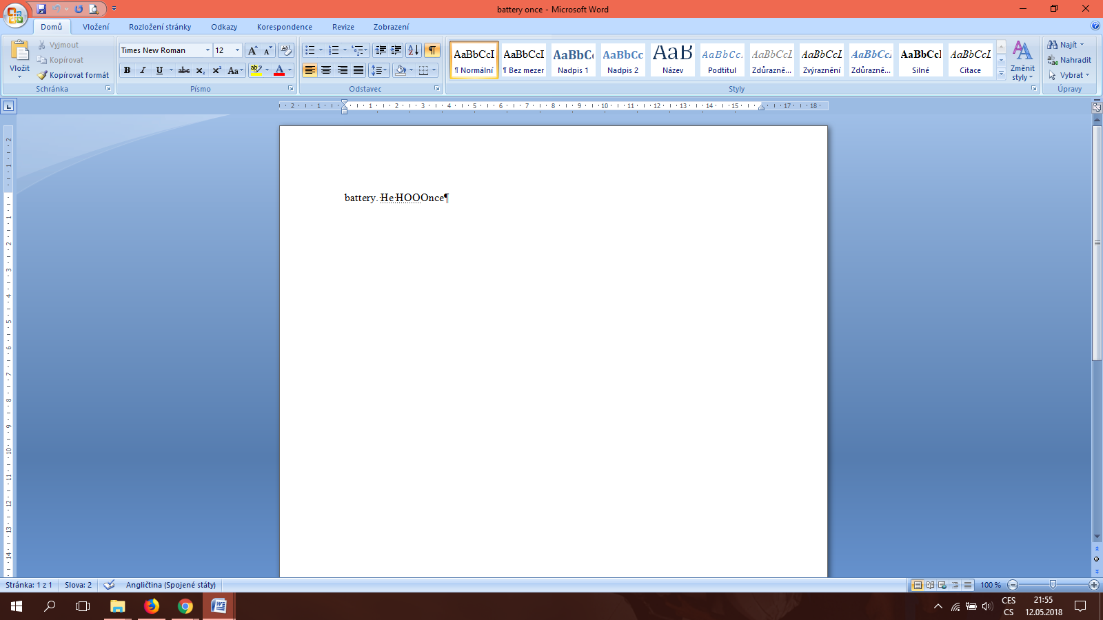 V přiloženém souboru MS Office Word (mám verzi 2007) jsou napsaná dvě slova (battery. Once). Když ale zobrazím formátovací značky (zobrazí netisknutelné značky, jako např. mezery a konce odstavců), najednou se tam objeví podtržený nápis „He HOO“. Když značky nemám zobrazené, to „H“ nejde ani smazat. Jsem z toho jelen. Co to je zač?