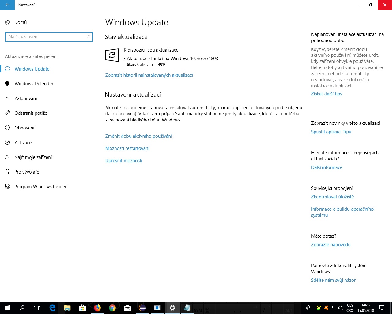 - od vynucení aktualizace na 1803 ("inicializace"), přes prohledávání současného stavu, stahování a instalaci cca 50 minut