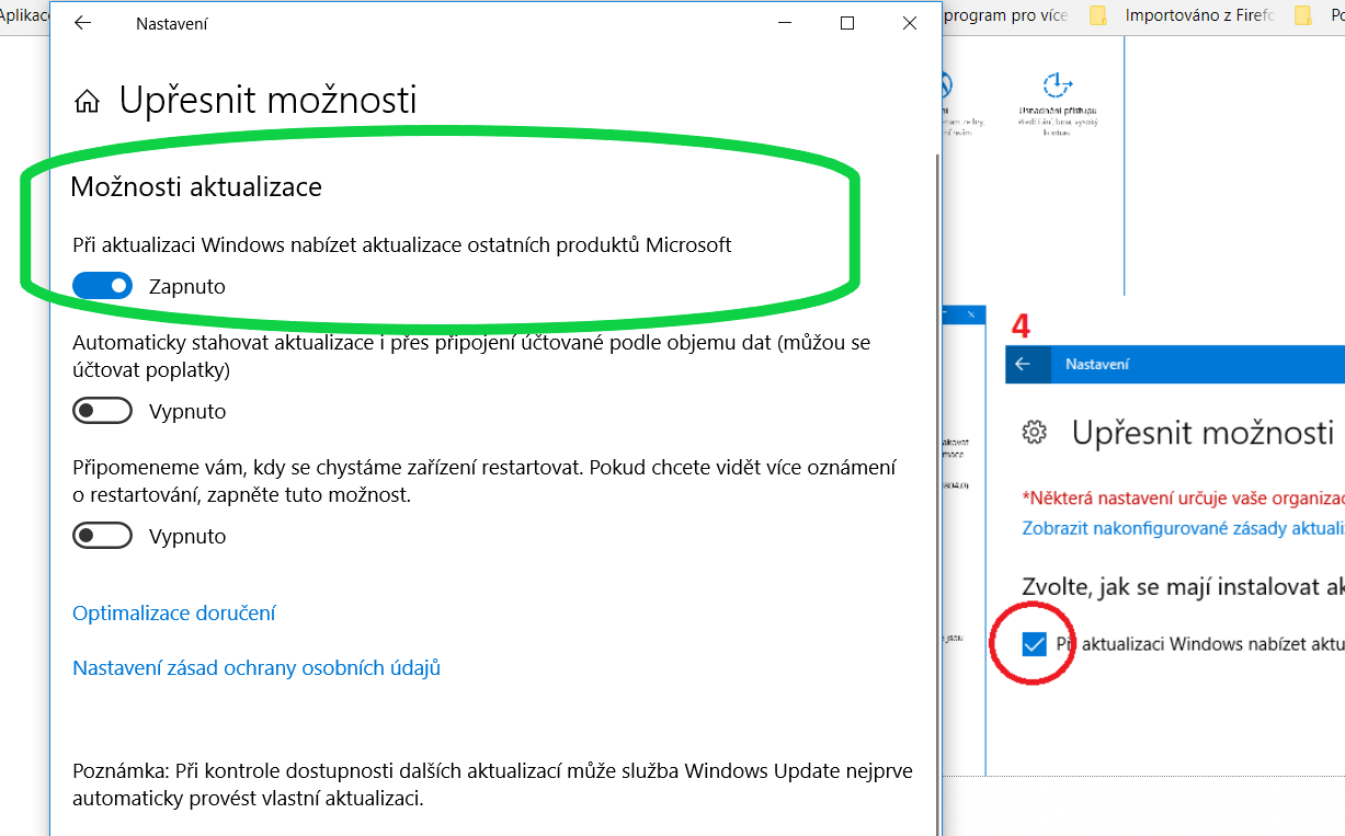 Děkuji moc! Asi pomohlo, ale v bodě 4 mám trošku jiný obrázek (přikládám screen), ale myslím, že jsem to udělal správně (zapnul jsem tu první možnost, jak je to teď na tom obrázku). Jen aby mi to bylo jasné, mám tedy čekat na další aktualizaci Win10 a tam mi snad už nabídnou i tu aktualizaci Office. Chápu dobře, nebo pro tu aktualizaci můžu udělat něco i teď?