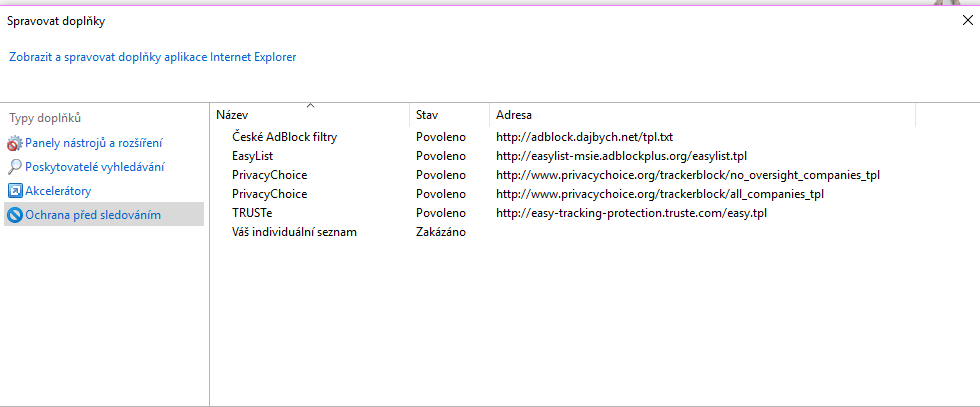 Například na Aktualne a Idnes stačí zakázat ukládání cookies a je po reklamách. To ale neplatí například na Novinky cz. Tam se uplatňuje některý z té hromady filtrů. Tyhle filtry se snad dají editovat v C:\Users\uživatel\AppData\Local\Microsoft\Internet Explorer\Tracking Protection, ale já hledám spíše hotový doplněk nebo hodně obsáhlý filtr, převážně českých webů.