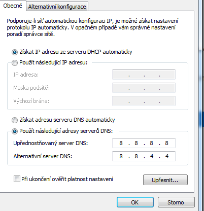 3. zkontrolovat, že máš zvolený první radiobutton, tj. získat adresu DNS serveru z DHCP serveru.
