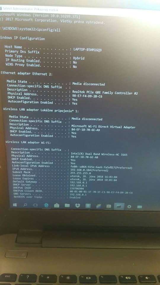 Tiež urobené na pár dní dozadu a stále internet obmedzený ... práve som zadal cez CMD IPCONFIG/all a…