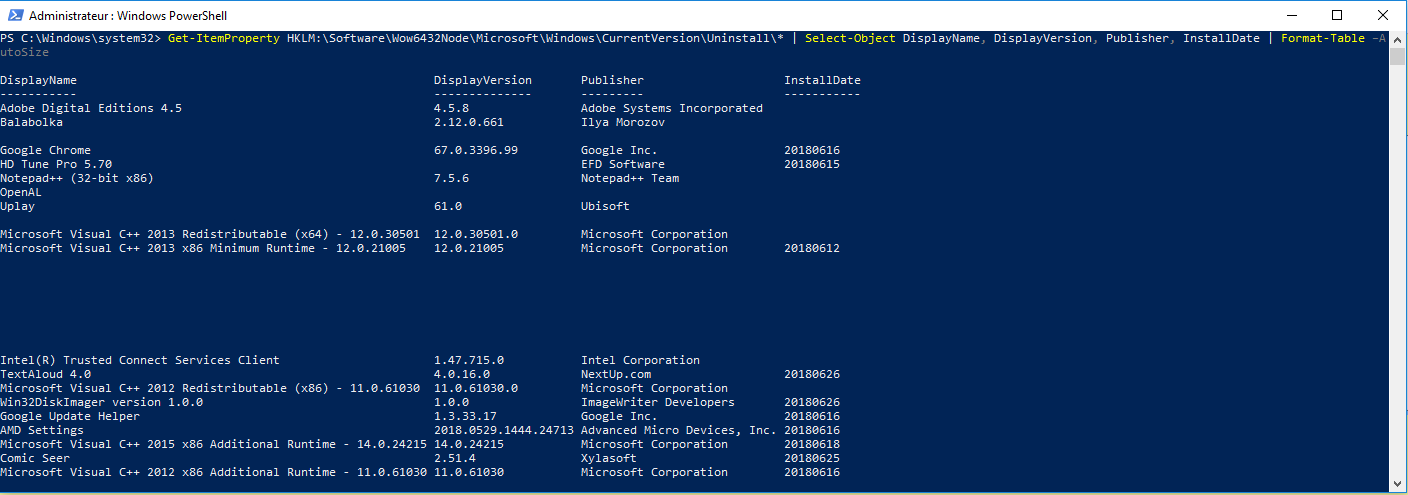 Get-ItemProperty HKLM:\Software\Microsoft\Windows\CurrentVersion\Uninstall\* |  Select-Object DisplayName, DisplayVersion, Publisher, InstallDate | Format-Table –AutoSize