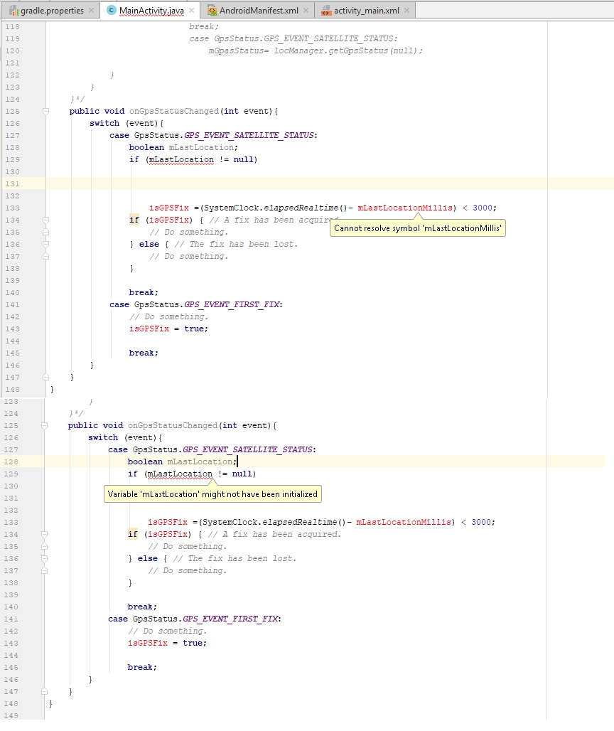 Tam také plonková proměnná isGPSFix když je řádek kódu isGPSFix =(SystemClock.elapsedRealtime()- mL…