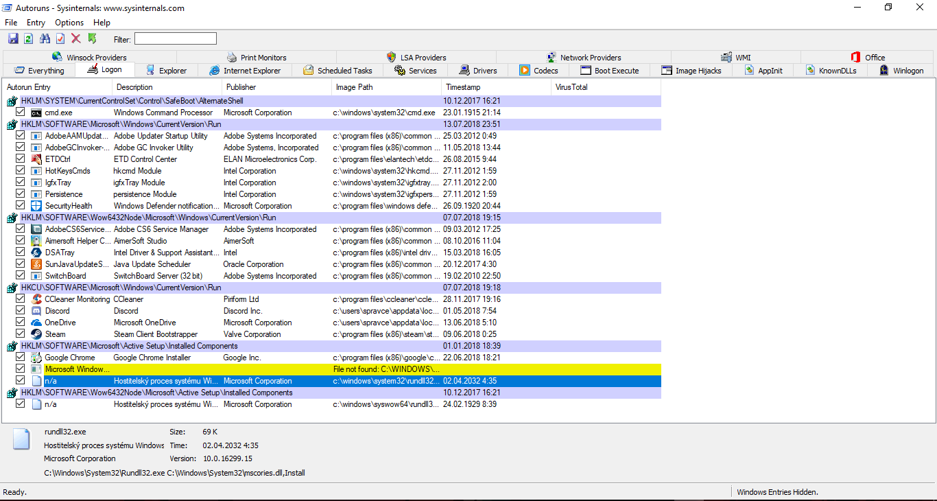 žlutý "not found" záznam vedoucí přímo do spouštěcího adresáře \windows je pravděpodobný pozůstatek spyware. proč to máš schované fak nechápu.