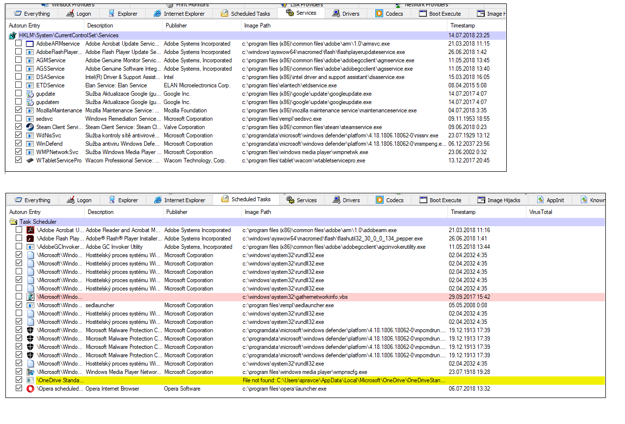 V ms autoruns (záložka logon) jsou poslední dvě položky n/a , jejich Image path obsahuje rundll32 (příloha GG.png), to mi příjde hodně divný, ještě se podívám do Services a Scheduled tasks
