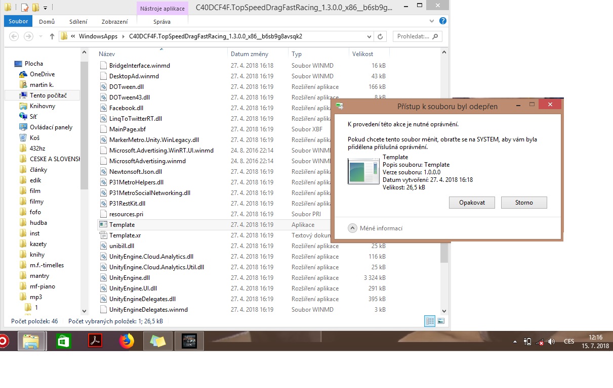 Ahoj, mám win 8.1, přes win store jsem si stáhl hru- top speed drag fast racing- Vše fungovalo normálně. Předevčírem jsem po půl roce ručně aktualizoval win, stáhl jsem jen nejdůležitější aktualizace. A když jsem chtěl spustit uvedenou hru, tak se to seklo na úvodní obrazovce. Při aktualizaci se mi stál nějaký soubor- aplikace Template, která tam předtím nebyla. A tato aplikace způsobuje vytížení HDD na 100% a nefunkčnost hry. Když do dám ukončit úlohu-template, tak se hra rozjede. Pokoušel jsem se to ručně i přes Revo Unistal odstranit, ale píše to, že nemám oprávnění. Přitom na noťasu jsem nastaven, jako správce a noťas používám jen já. Jak tuto aplikaci odstranit? dík předem.