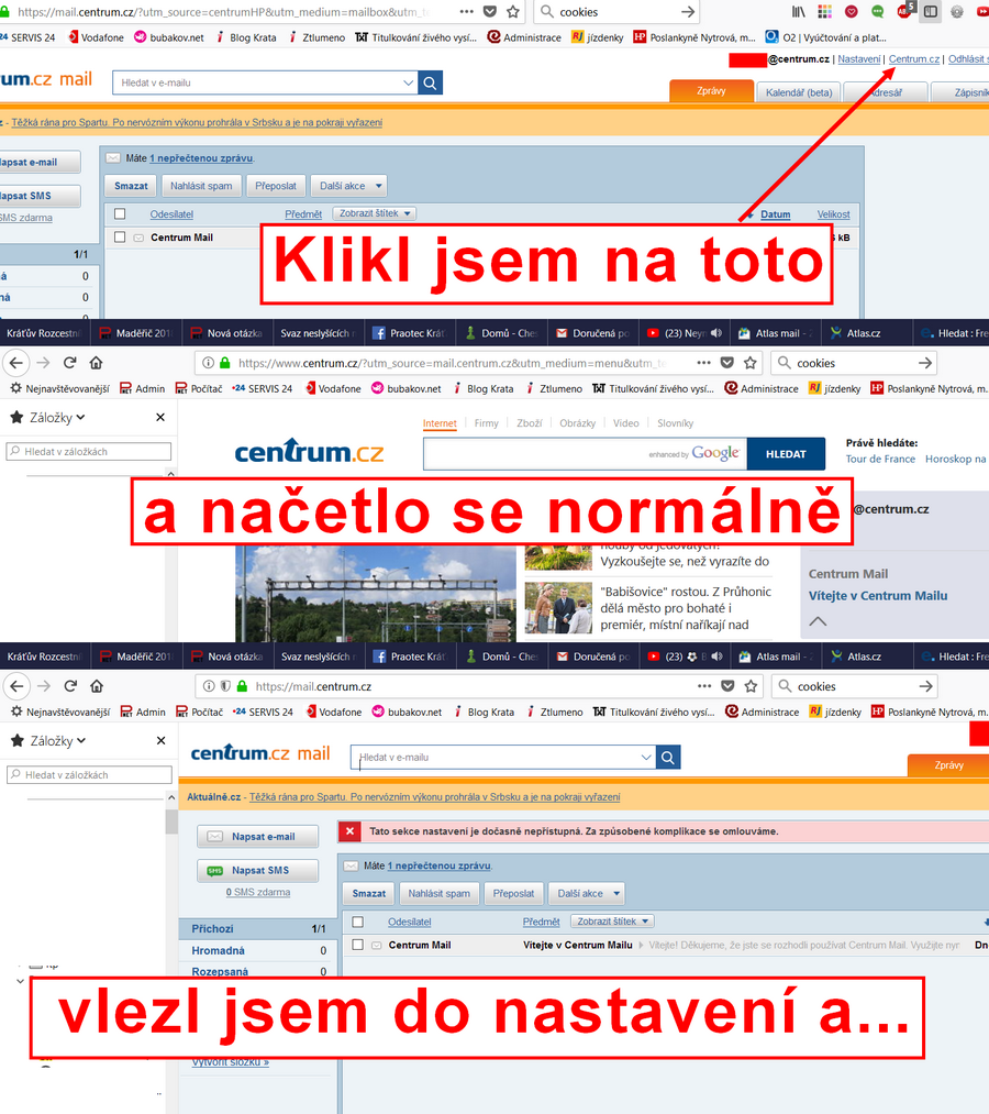 - Pokud ale z pošty kliknu rovnou na odkaz Centrum (tedy na home page), tak dojde k tomu chybnému načtení a to se pak opakuje pokaždé, takže z tohoto prohlížeče už se na mail na centrum.cz nemám možnost přihlásit."