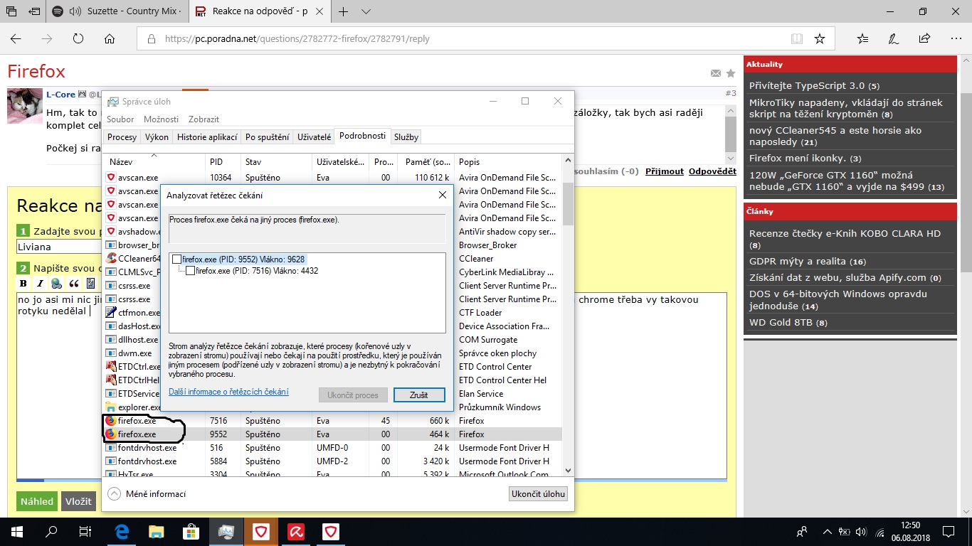 Kdykoliv chci spustit prohlížeč mozillu tak vůbec nereaguje. Když na něj kliknu tak se chvíli točí kolečko jakože se zapíná, ale prohlížeč se přesto nespustí. Ve správci úloh se mi zobrazuje, že běží ale reálně nefunguje už mi to takhle dvakrát dělalo tak jsem celej prohlížeč přeinstalovala ale po dvou měsících se to dělo znova tak znova reinstal, ale po třetí se mi to už dělat nechce co s tím