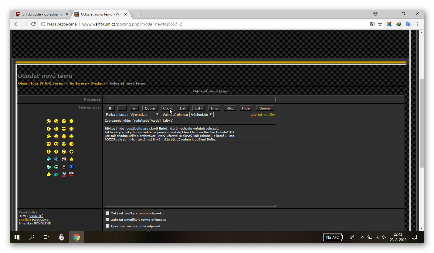Dobrý večer,neviem či správne napíšem.Ako dám hocijakú URL adresu napr.https:// www.zoznam.sk do code.Napr.píšem do nejakého fora pre pomoc alebo pre radu niekomu,napíšem kratší-dlhší text,a potom tam dám túto vyššie spomínanú adresu do code