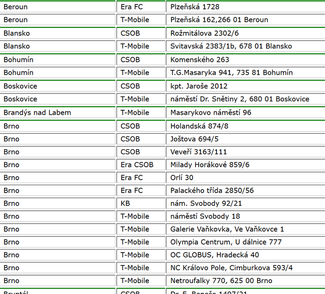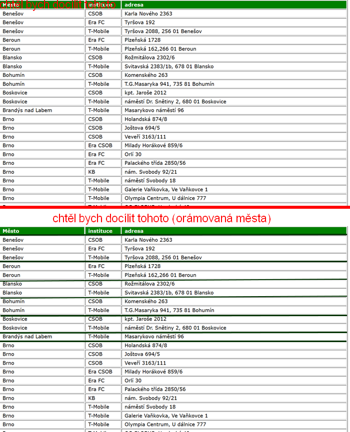 mám výpis měst a v nich instituce. Líbilo by se mi nějak oddělit další město, aby to bylo přehlednější. Stačilo by jen "každé nové" řádek s rámečkem nahoře.