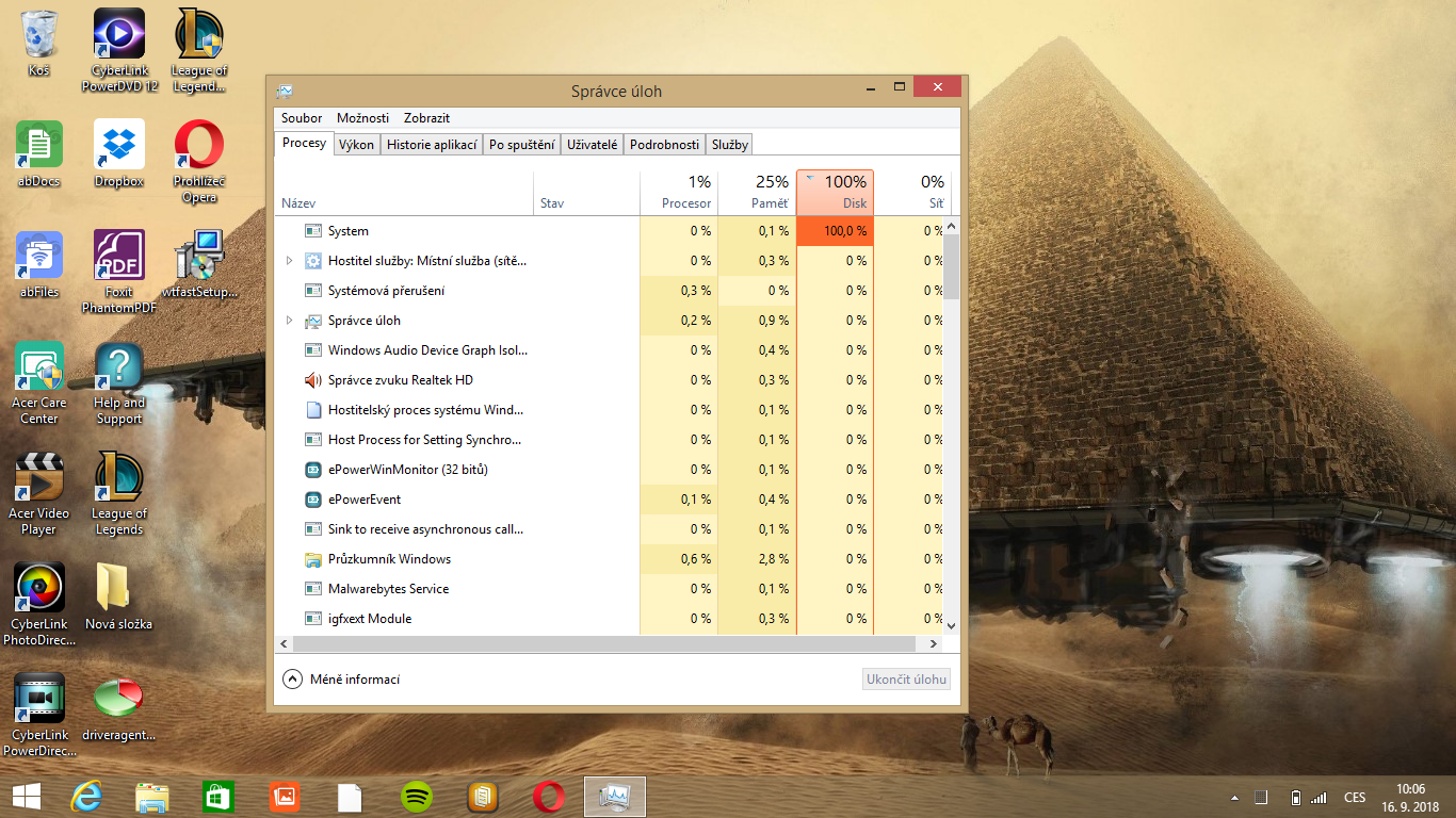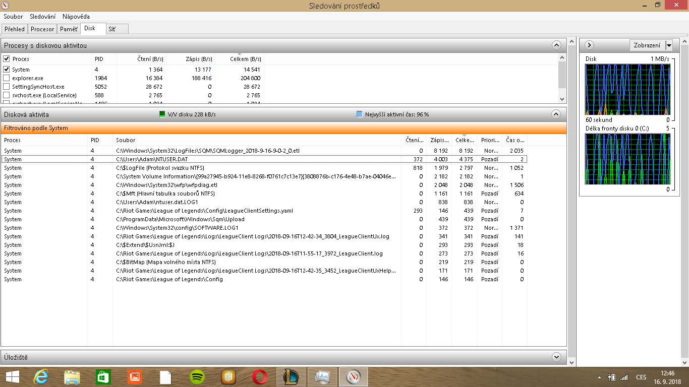 Dobrý den, mám asi 2,5 roku starý notebook Acer a už nějakou dobu mě zlobí. Teď už to bohužel zašlo do extrému a nedá se s ním skoro nic dělat. Disk mi neustále ukazuje vytížení na 100% a pokaždé z jiného důvodu, nejčastěji za tím je proces "System". Děje se to i v nečinnosti bez sebemenší aktivity, občas si zapnu i hru a pár minut to jede, ale zase se to zasekne. Zkusil jsem už všechno čeho jsem jako laik schopen - disable Superfetch, BITS, Windows Search, Windows Update, zkontroloval jsem řadiče, pomocí MalwareBytes vymazal všechno co škodilo a stále nic nezabírá. Podle CrystalDiskInfo by měl být HDD v pořádku. Prosím poraďte mi už si vážně nevím rady :)