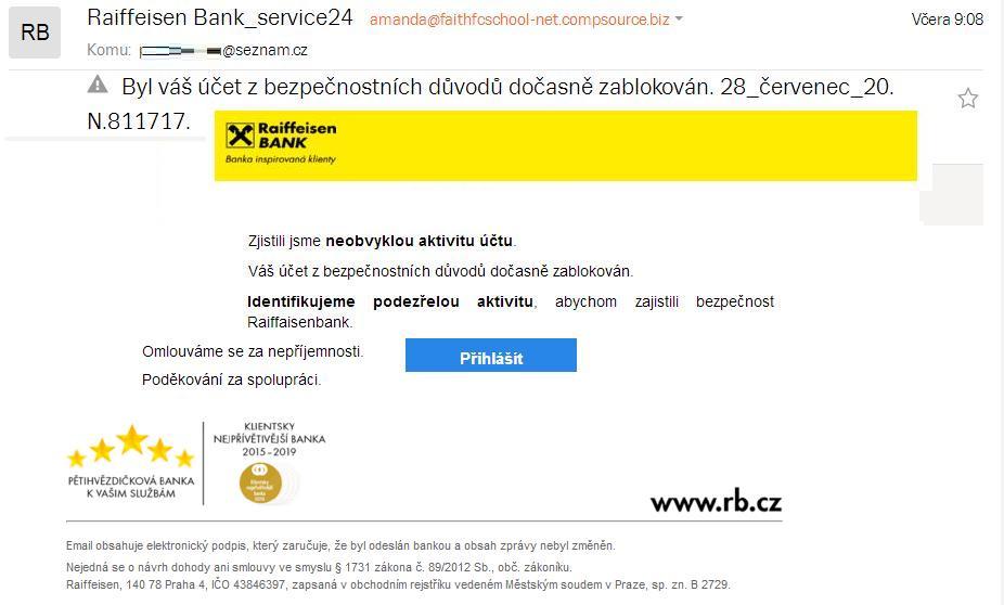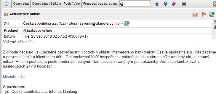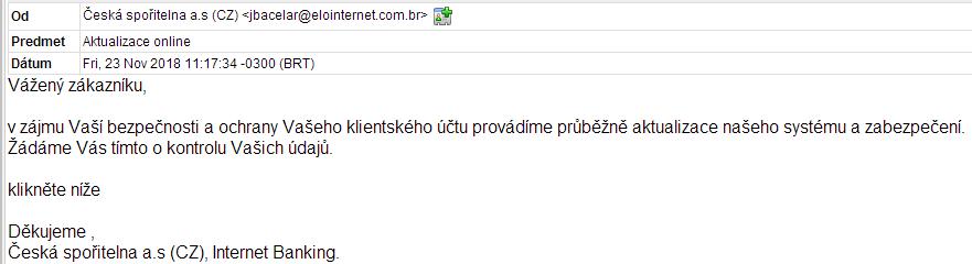 upozorňujeme na novou podobu podvodného e-mailu (tzv. phishingu), kterou jsme v posledních dnech zaznamenali a která se snaží vzbudit dojem, že byla odeslána Českou spořitelnou. Podvodníci se jejím prostřednictvím snaží vylákat vaše přihlašovací údaje na podvodné přihlašovací stránce.