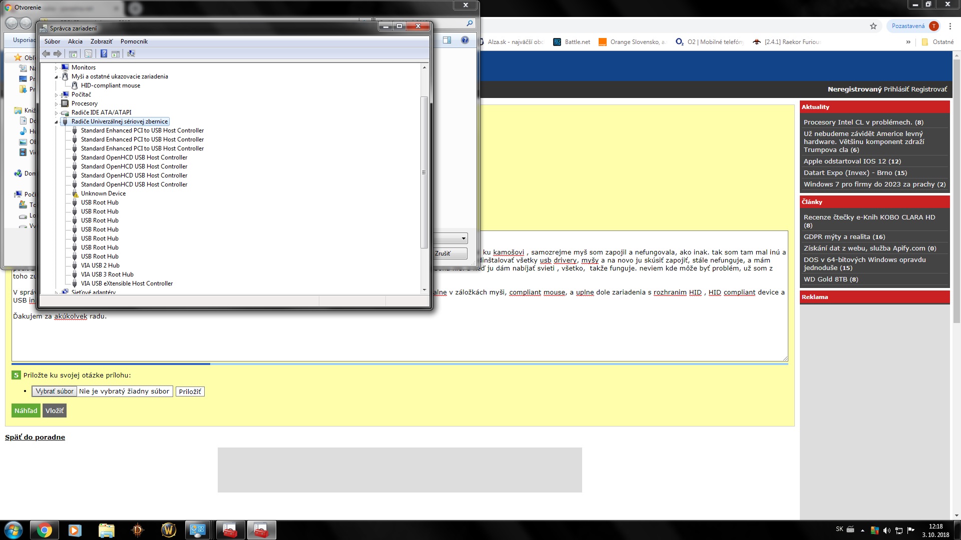 Mám taký problém, že som prednedávnom odpojil doma myš a vzal ku kamošovi ,že si zahráme. bloodytech r8a , bezdrotova. Keď som prišiel ku kamošovi , samozrejme myš som zapojil a nefungovala, ako inak. tak som tam mal inú a keď som sa vrátil domov a zapojil myš do toho istého portu, tak myš odvtedy nefunguje. v správcovi zariadení som už skúšal úplne všetko- odinštalovať všetky usb drivery, myšy a na novo ju skúsiť zapojiť, stále nefunguje, a mám pocit že sa hlási ako HID compliant device. druhá myš ktorá je cez kábel v USB funguje uplne normálne. a ta myš proste ani za boha nie. a keď ju dám nabíjať svieti , všetko, takže funguje. neviem kde môže byť problém, už som z toho zúfalý , asi ju vyhodím von oknom.