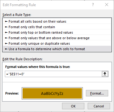 Mám nastavené, že, při 0, buňka změní barvu. Za určitých okolností (konkrétně, když je specifická buňka vyplněna), ale v souvislosti s výpočtem to vychází 0, tak buňka zůstané bílá.