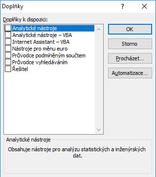Měl jsem zaškrtnuté (default?) vše kromě Řešitele. Když vše odškrtnu, otevírá se *xls normálně (desetiny vteřiny). Tyhle doplňky jsou (snad) jen nějaké pomocné věci, pokud "pomoc" nepotřebuji, snad to k ničemu nepotřebuji(?). Nebo to přidává funkcionalitu?