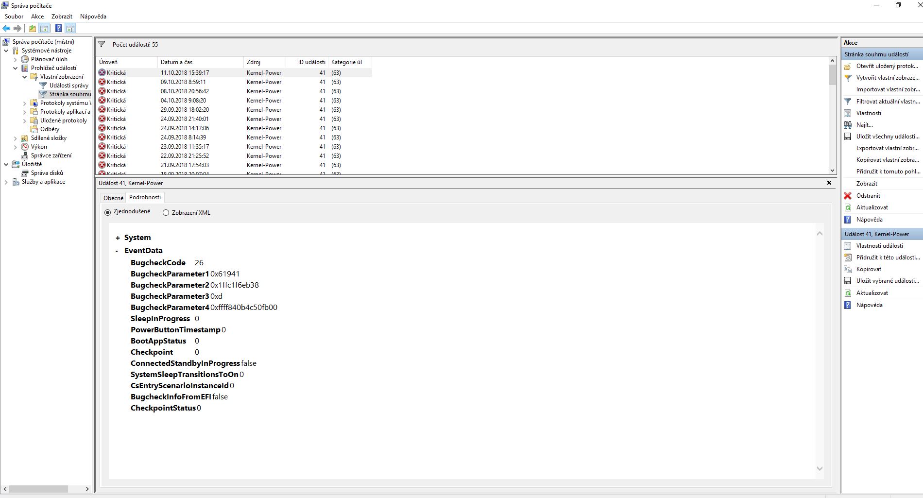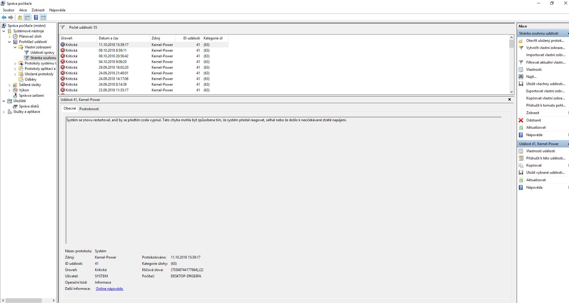 Ve správci počítače jsem v historii našel, že modrou obrazovku mi způsobuje Kernel-Power 41 (přiložený screen a nějaký vygenerovaný soubor v příloze)