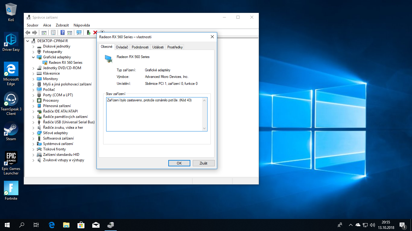 Dobrý den,2dny zpět jsem si pořídil novou grafickou kartu Radeon rx 560 4gb ddr5 a už mám jeden problém.. Všechno funguje,počítač normálně naběhne.. Jenže ve správci zařízení mi to ukazuje u grafického adaptéru vykřičník s větou : Zařízení bylo zastaveno, protože oznámilo potíže. (Kód 43).Stáhl jsem si nové drivery přesně ze stránky pro danou grafiku která je radeon rx560 4gb ddr5
